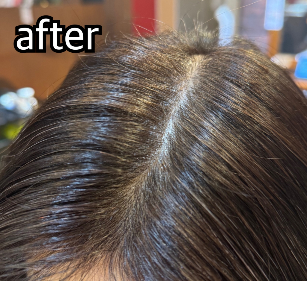 ①少ないダメージで安心 白髪染めカラー特有の“きしみ”や“パサつき”を感じさせない! 薬剤に頼らず、髪と頭皮にやさしい処方でツヤツヤの手触りに。